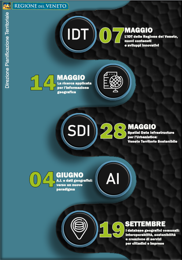 La Regione, attraverso la Direzione Pianificazione Territoriale, riveste da alcuni decenni il ruolo di produttore di dati geografici, in forza della Legge n. 28 del 1976 (Formazione della Carta Tecnica Regionale), a cui si accompagna il compito di gestire il patrimonio informativo attraverso l’Infrastruttura Dati Territoriali (IDT) realizzata secondo i principi della Direttiva del Parlamento Europeo n. 2007/2/CE INSPIRE (Infrastructure for Spatial Information in Europe). Negli ultimi anni il settore si presenta particolarmente dinamico sia per l’incessante progresso tecnologico sia per l’ampliamento del numero delle ricadute pratiche che si traduce in una più vasta platea di soggetti beneficiari dei servizi basati sui dati territoriali. I grandi mutamenti in corso suggeriscono di incentivare ulteriormente le dinamiche di collaborazione con il territorio, già peraltro praticate con successo mediante numerosi accordi con soggetti della PA locale e centrale, con l’Università di Padova, i suoi diversi dipartimenti e centri, il Master di Secondo Livello in GIScience e SPR, anche incrementando il livello delle forme di comunicazione in termini di quantità e di qualità. Da queste considerazioni ha preso spunto l’iniziativa proposta ai tecnici e agli amministratori pubblici del Veneto con un ciclo di 8 webinar per descrivere interamente l’articolata sfera di azione della Regione.