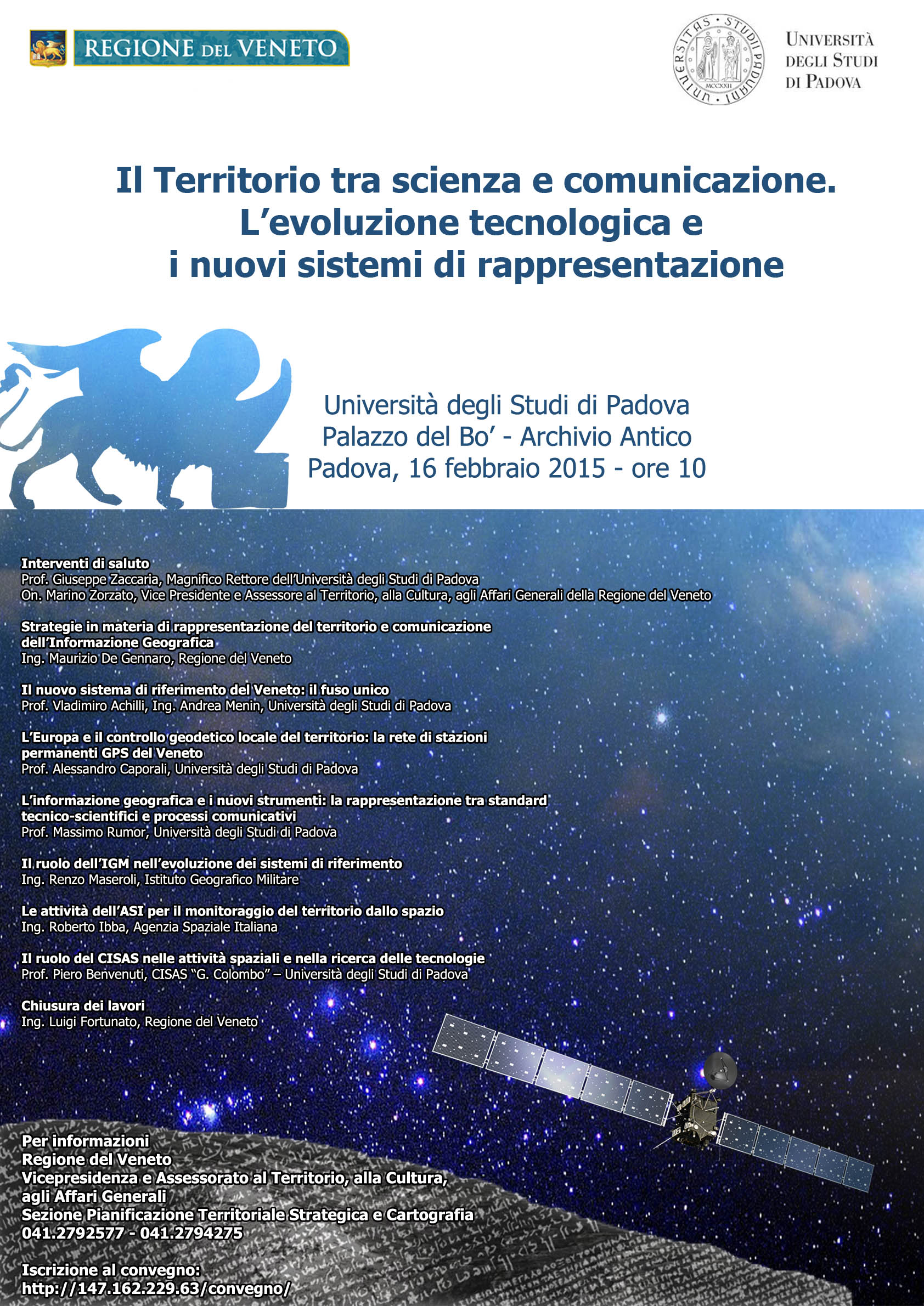 Le oltre 100 persone intervenute hanno avuto l’opportunità di condividere molti innovativi spunti di discussione presentati dal Direttore della Sezione Pianificazione Territoriale Strategica e Cartografia ing. Maurizio De Gennaro e dal dott. Umberto Trivelloni grazie al prezioso contributo del prof. Alessandro Caporali del CISAS (Università di Padova - Centro di Ateneo di Studi e Attività Spaziali "Giuseppe Colombo"), di Pierpaolo Milan membro dello staff di esperti tecnici del CISIS (Centro Interregionale per i Sistemi informatici, geografici, statistici) e dell’ing. Virgilio Cima libero professionista nel settore della cartografia e dell’informatica applicata; gli estensori degli interventi rappresentano realtà che da diversi anni collaborano con la Regione del Veneto per il mantenimento e l’aggiornamento del patrimonio dei dati geotopografici, base primaria dell’informazione territoriale.