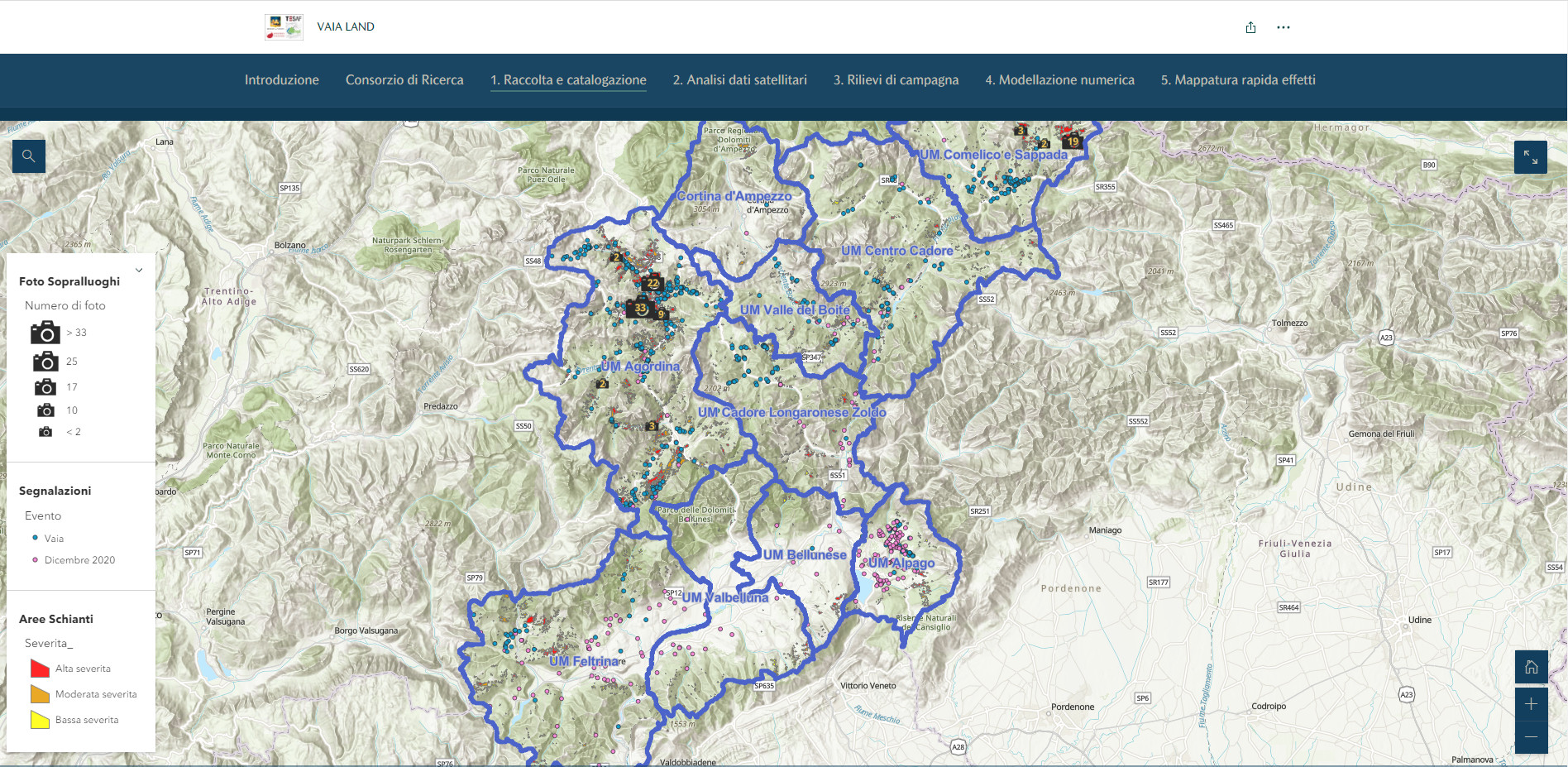 - predisposizione di un webgis in cui sono stati archiviati i dati delle aree di maggior interesse, i dati puntuali relativi alle segnalazioni degli eventi VAIA e dicembre 2020, i dati puntuali e poligonali dei sopralluoghi dei due eventi meteorologici, i dati relativi agli schianti dell’evento VAIA, i dati e i prodotti del telerilevamento (PHInsar, ortofoto e immagini SPOT);