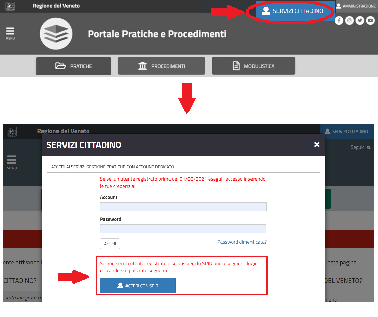 Cliccando su Modulistica online si accede al portale dedicato alle Pratiche, Procedimenti e Modulistica della Regione del Veneto.