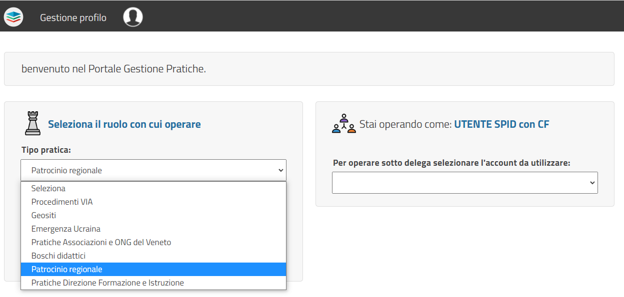 Una volta inserite le credenziali di accesso, sarà sufficiente scegliere la pratica Patrocinio regionale presente tra le opzioni nel menù a tendina e seguire la procedura guidata per la richiesta del patrocinio.