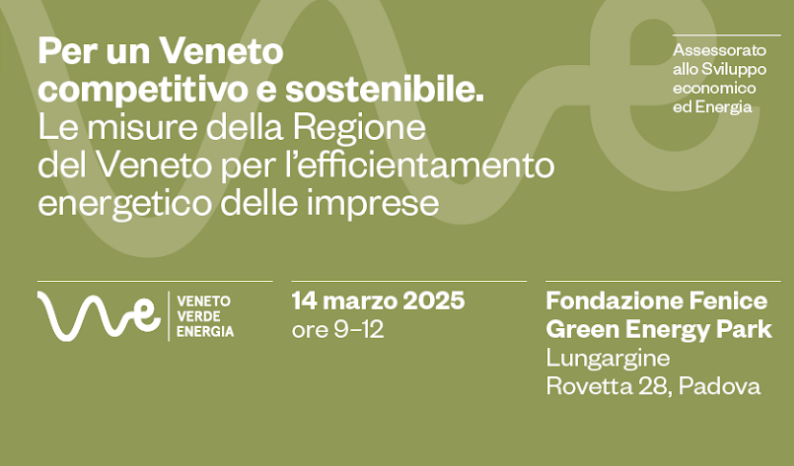 La Regione del Veneto - Assessorato allo sviluppo economico ed Energia e l’Area politiche economiche, capitale umano e programmazione comunitaria - promuove l’evento “Per un Veneto competitivo e sostenibile. Le misure della Regione del Veneto per l’efficientamento energetico delle imprese” che si terrà Venerdì 14 marzo 2025