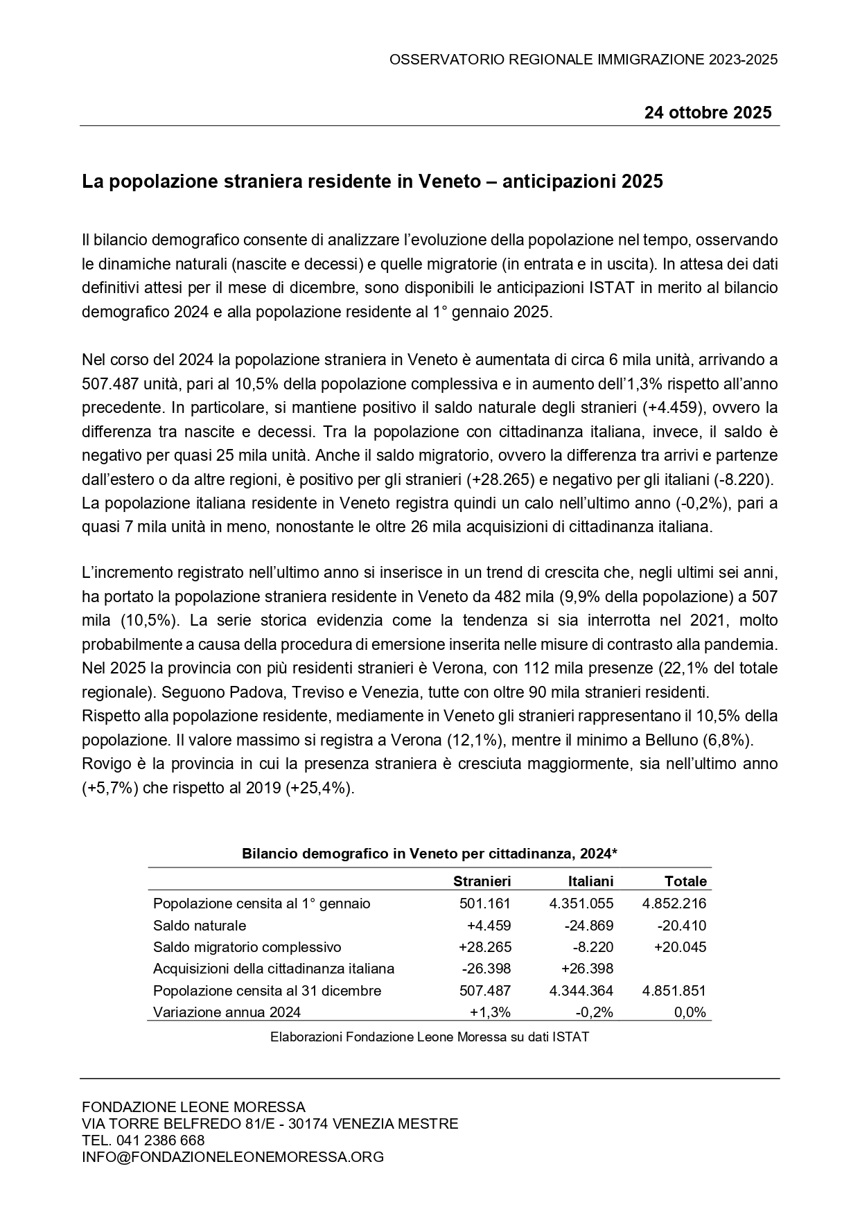 La popolazione straniera residente in Veneto – anticipazioni 2025