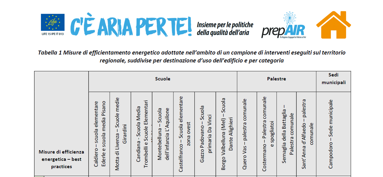 In Tabella 1 sono riportate, per ciascuno dei succitati interventi, le misure di efficientamento energetico adottate, suddivise per tipologia sulla base di quanto riportato nei paragrafi precedenti.