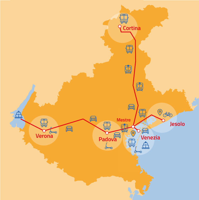 - percorsi urbani o extraurbani sull’asse Venezia/Mestre – Padova – Verona che combinano l’uso di più mezzi di trasporto e mobilità;