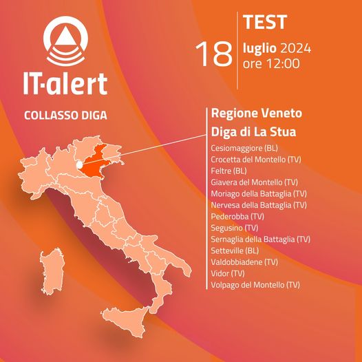 Comunicato Stampa n. 1073 - Il 18 luglio nuovo test del sistema IT-Alert, 13 comuni coinvolti. Zaia: “Verrà simulato il collasso della diga la Stua, importante prendere confidenza con il sistema di allerta”