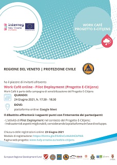 La Protezione Civile della Regione Veneto ha il piacere di invitarvi al Work Cafè del Progetto Comunitario E-Citijens che si terrà il giorno 24 Giugno alle ore 17.30 in modalità online.
