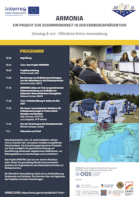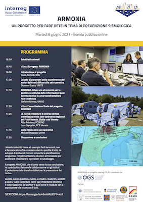 Lunedì 7 e martedì 8 giugno si svolgerà l'evento finale del progetto interreg "Armonia". La prima giornata sarà rivolta esclusivamente ai Partner di progetto per confrontarsi sui lavori svolti, mentre l'8 giugno la partecipazione sarà aperta a tutti e sarà l'occasione per divulgare i risultati del progetto e le sue applicazioni pratiche nell'ambito della protezione civile. Sotto riportato il programma (versione Itliana e versione Austriaca) con le modalità di partecipazione online: