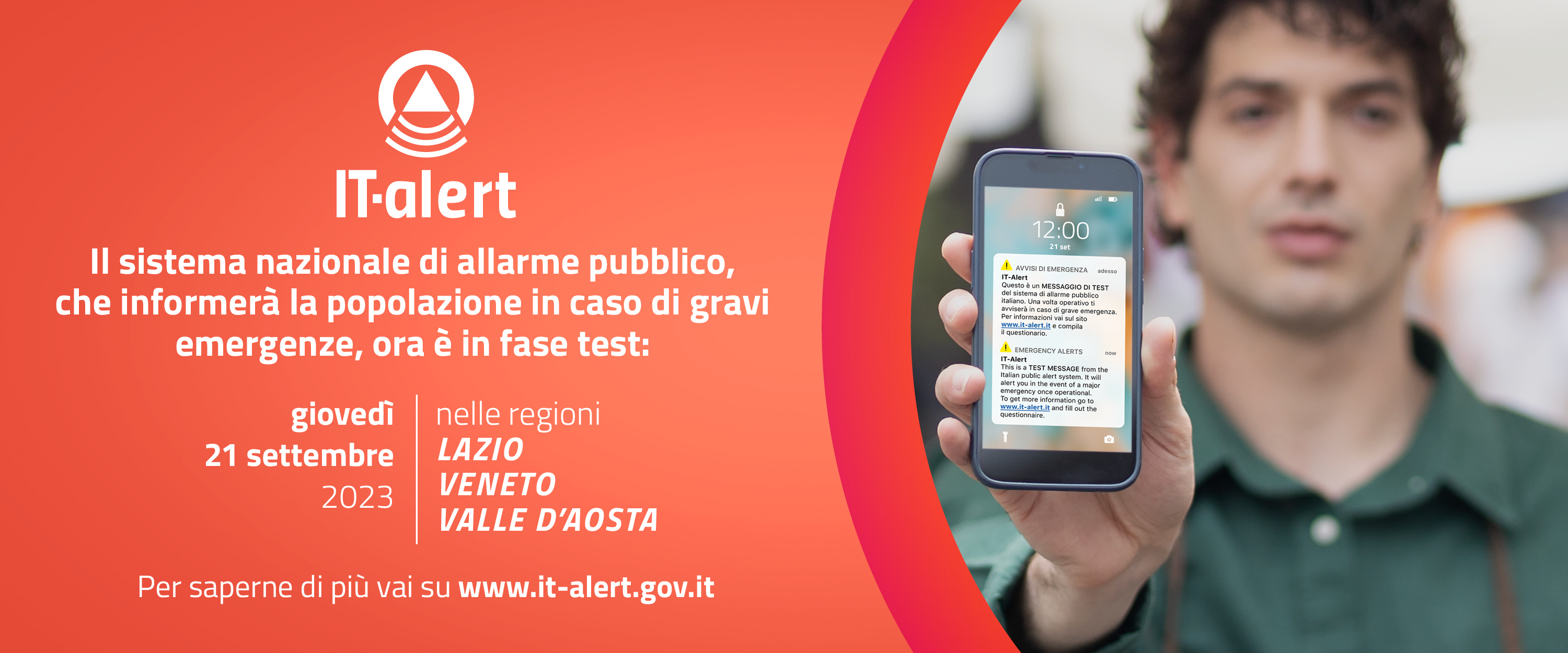IT-ALERT. Martedì 12 settembre verso le ore 12 i telefoni cellulari in Friuli Venezia Giulia saranno raggiunti da un messaggio di test IT-alert, il nuovo sistema di allarme pubblico nazionale. Tutti i dispositivi agganciati a celle di telefonia mobile della Regione Friuli Venezia Giulia suoneranno contemporaneamente. Anche i territori dei comuni veneti confinanti con il Friuli Venezia Giulia potranno essere raggiunti dal test IT-alert.