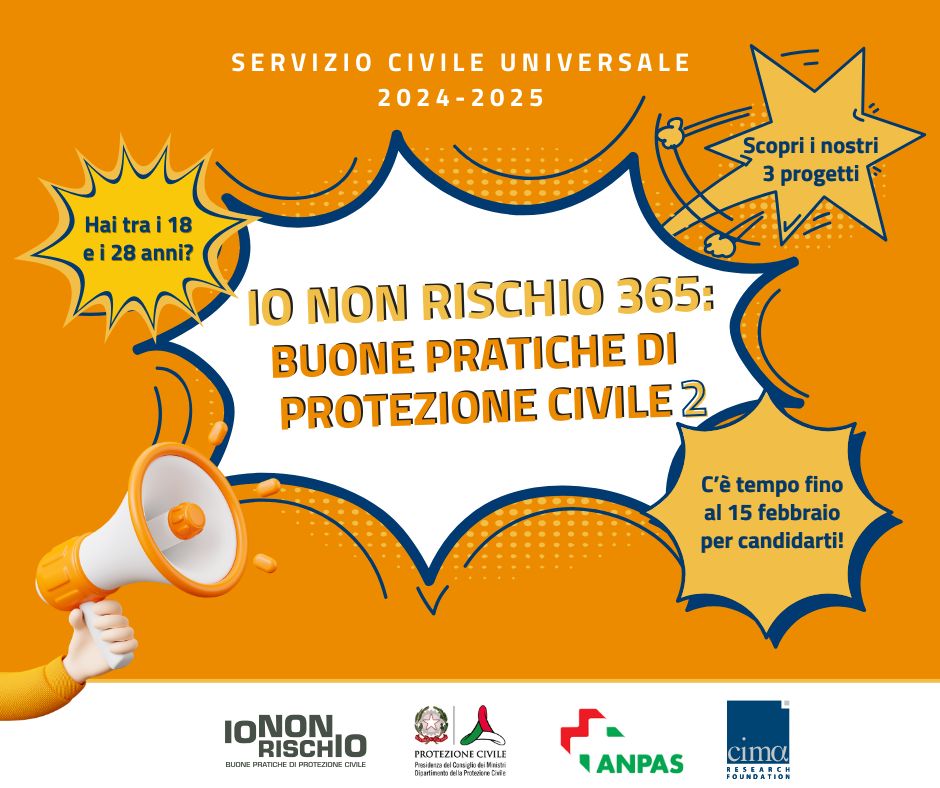 Anche quest’anno la campagna Io non rischio rientra tra i progetti di servizio civile selezionati dal Dipartimento per le Politiche giovanili e il Servizio Civile Universale. “Io non rischio 365: buone pratiche di protezione civile 2”, promosso da Anpas in collaborazione con il Dipartimento della Protezione Civile e Fondazione Cima, prevede la partecipazione di 32 volontari che, per 12 mesi, saranno coinvolti nelle diverse attività di informazione, sensibilizzazione e riduzione del rischio che sono il cuore della campagna.