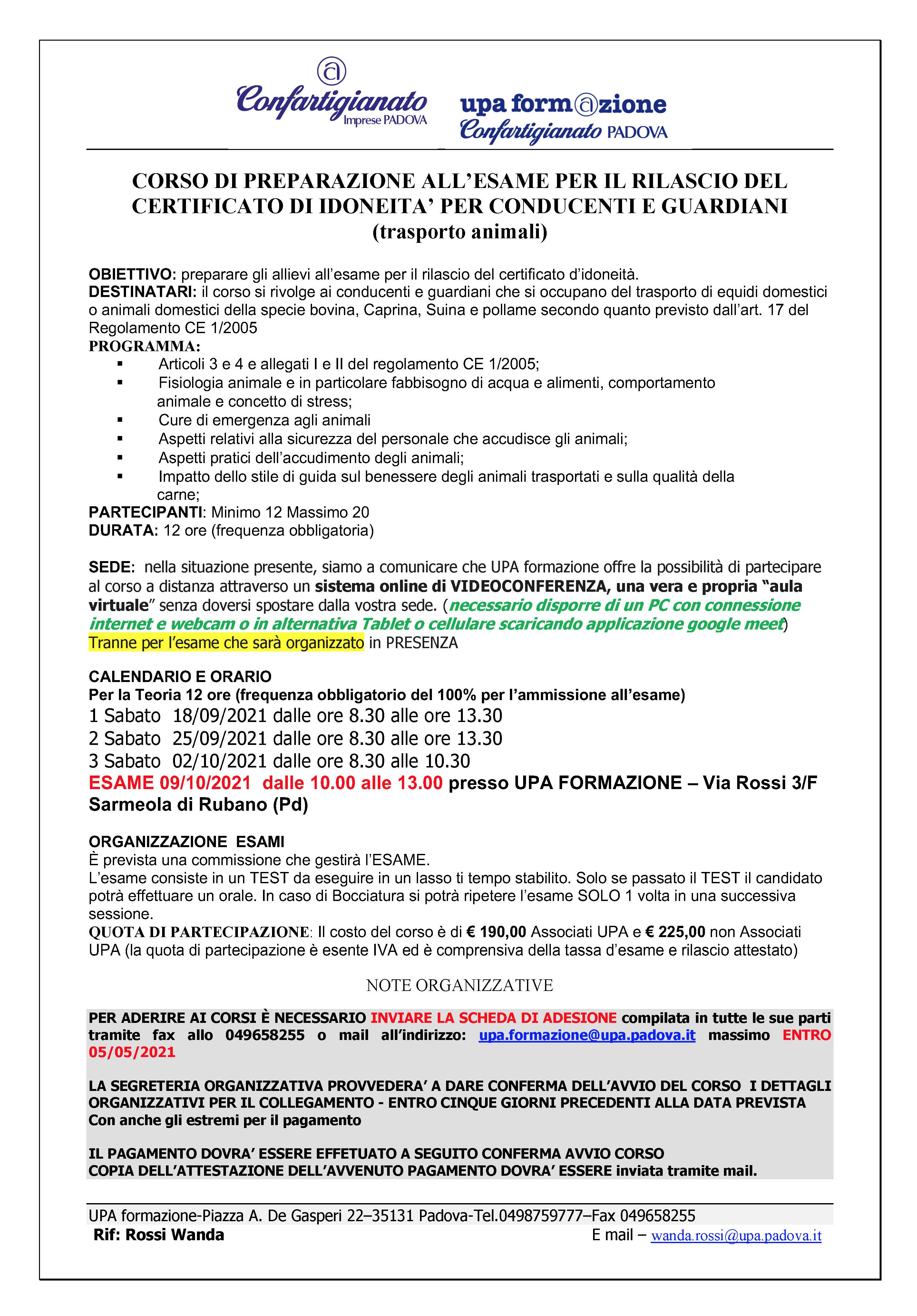 - Corso di formazione per conducente e guardiani di veicoli stradali che trasportano animali vertebrati vivi. Modalità di videoconferenza su piattaforma Zoom. Giorni del corso: 25, 26 e 27 febbraio e 5, 6 marzo 2021. Programma