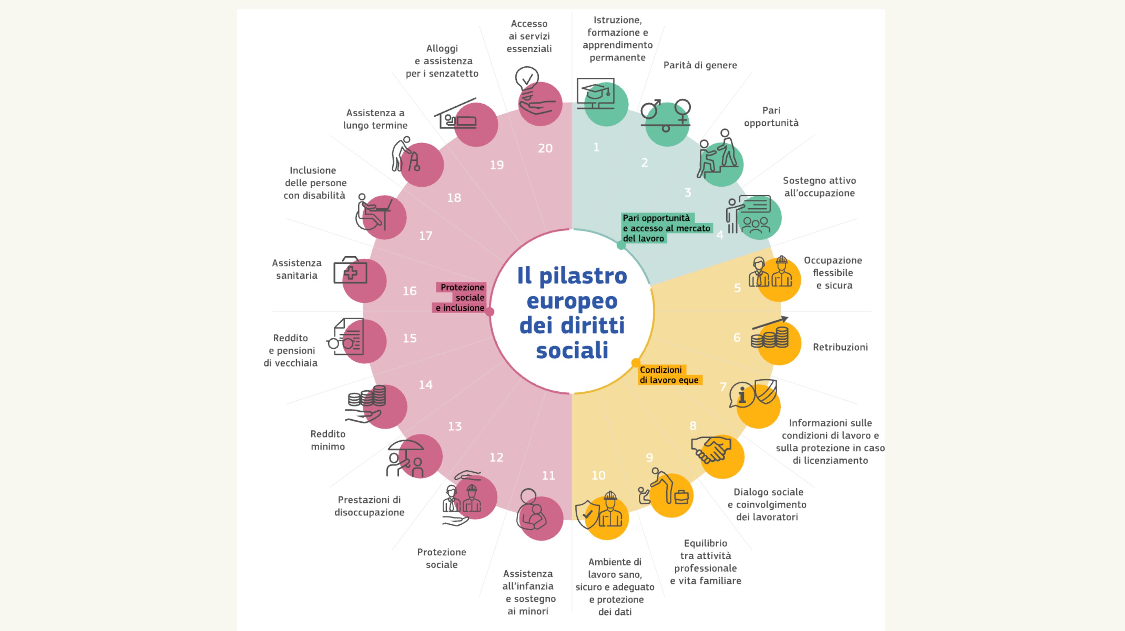 Il Pilastro europeo dei diritti sociali rappresenta il quadro di riferimento dell’Unione per una società più equa, inclusiva e protettiva, fondata su 20 principi fondamentali: dall’accesso al mercato del lavoro, alle pari opportunità, dalla protezione sociale all’inclusione attiva.