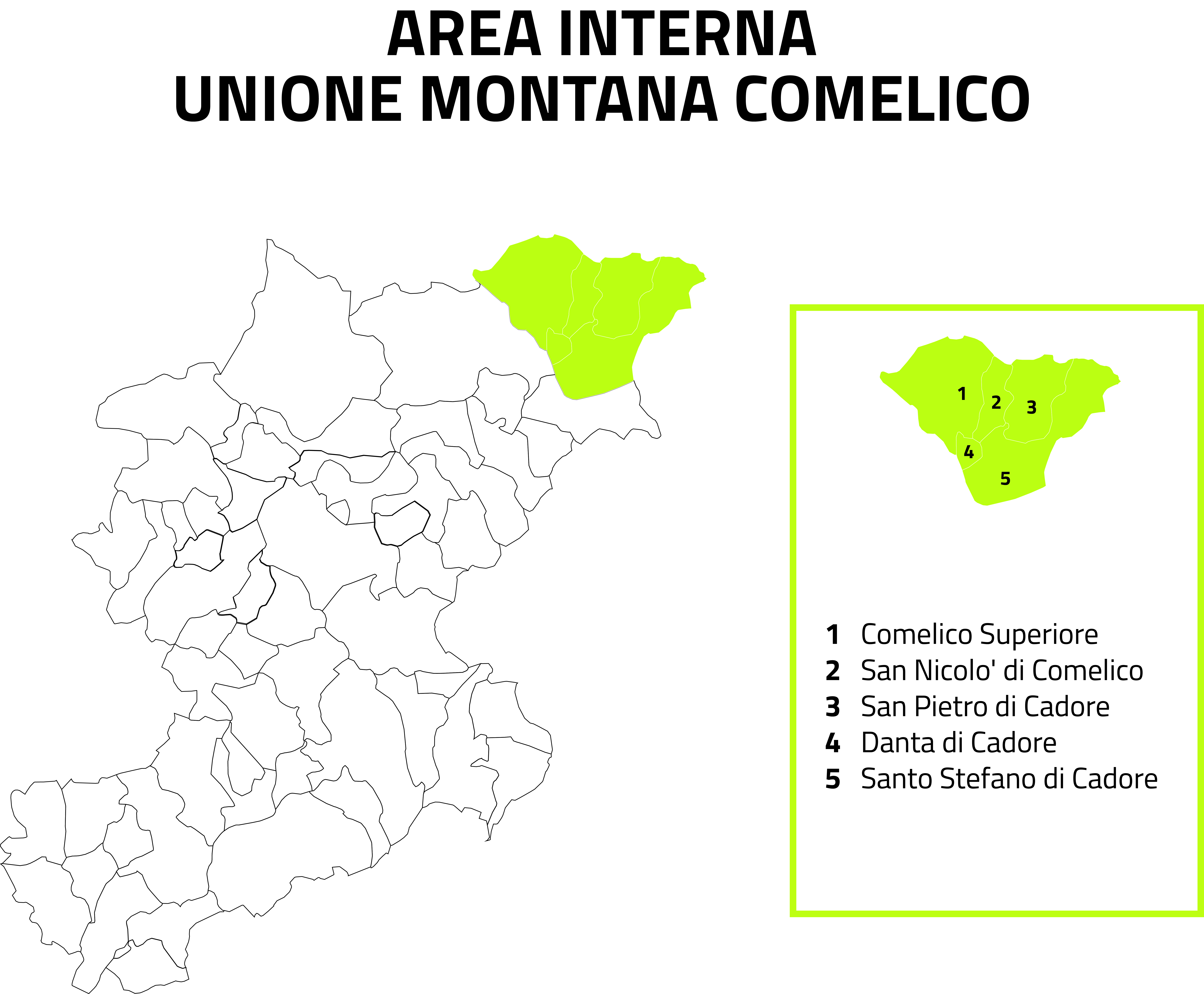 Territorio: I Comuni interessati dalla Strategia Aree Interne sono i 5 dell’Unione Montana del Comelico: Comelico Superiore, Danta di Cadore, San Nicolò di Comelico, San Pietro di Cadore, Santo Stefano di Cadore