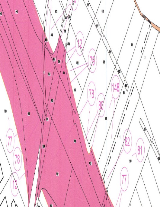 Le intestazioni catastali dei proprietari sono rappresentate da un numero di piano, evidenziato nella mappa da un cerchio rosa che segnala la posizione delle particelle nella tavola di riferimento.